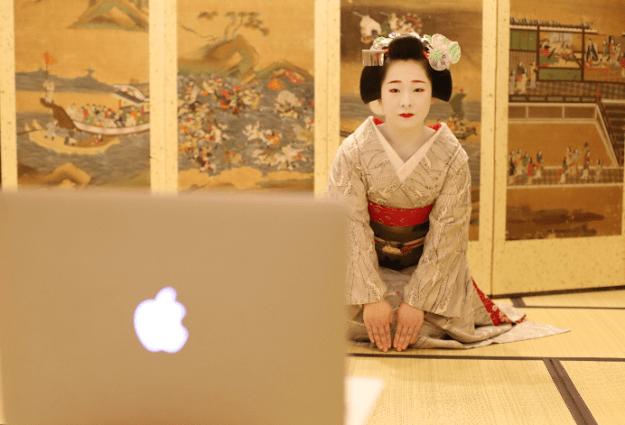Times have been challenging and the geisha in Kyoto are also trying to adjust. What was once a close and intimate experience kept to the confines of a teahouse has now become a shared experience that fuses technology with tradition. Geisha are taking their skills and talents to the online realm and are now performing with the aid of the internet for customers around the world. Anyone can now meet with a geisha, watch her dance, and ask her questions from anywhere via specially licensed venues.