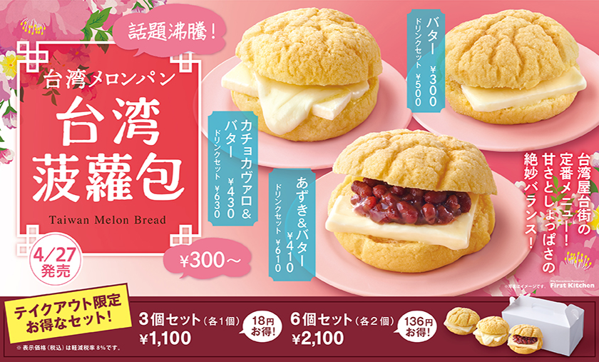台湾や香港では定番商品“菠蘿油(ポーローヤウ)”は、厚切りバターがインパクト大!朝食からおやつまで幅広く親しまれています。そんな商品がファーストキッチン特製メロンパンで登場!特製メロンパンは発酵バターの風味を感じられるパン生地に、焦がしバターの香りのビス生地というこだわりを詰め込みました。厚切りバターには、国産生乳100%使用の加塩バターを使用しました。パンごと温めることで挟んだバターがとろけ、甘じょっぱさが絶妙です!バリエーションで“菠蘿包(ポーローパーウ)”とも呼ばれる、バターのほかにファーストキッチンオリジナル北海道産ゆであずきを組み合わせた「あずき&バター」。北海道十勝花畑牧場の人気No.1チーズでもあるカチョカヴァロをサンドした「カチョカヴァロ&バター」もご用意。店内だけではなくお持ち帰りしてご家庭で温めていただくことでおいしくお召し上がりいただけます。